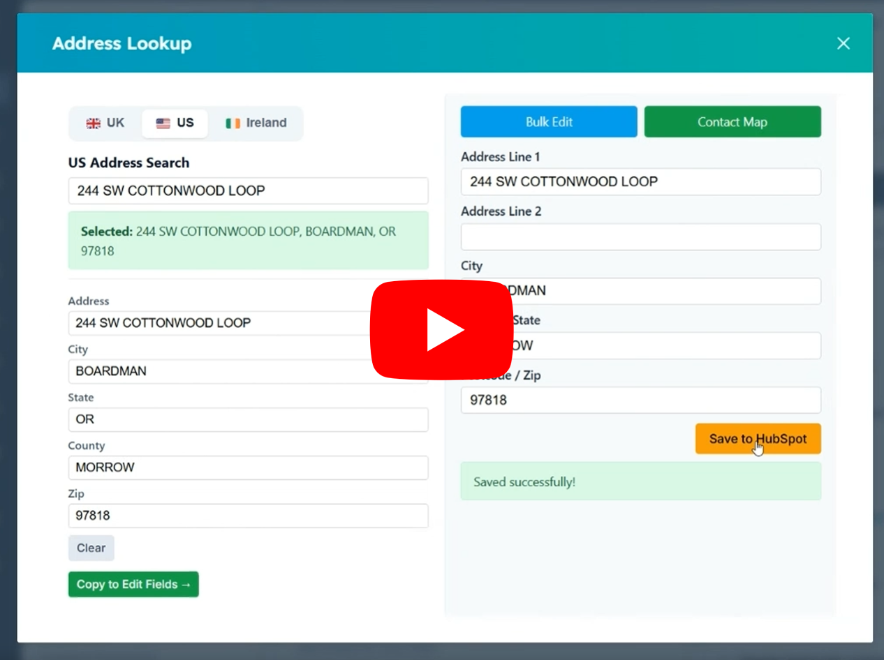 Autocomplete UK, US, and Ireland addresses directly inside HubSpot CRM. Bulk update, and view all contacts on an interactive map.